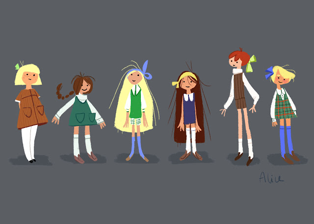 In the meantime, here a re-interpretation of Alice in Wonderland, set in the 70's, for my Character Design class at Calarts! It was a lot of fun to do those!